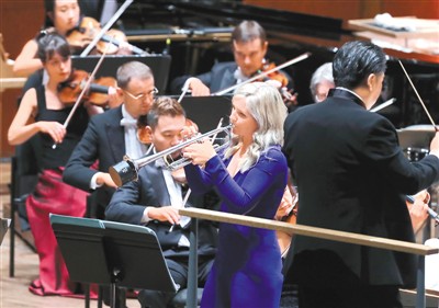 1月31日,紐約愛樂樂團(tuán)中國(guó)新年音樂會(huì)在美國(guó)林肯中心大衛(wèi)·葛芬音樂廳向當(dāng)?shù)赜^眾奉獻(xiàn)了一場(chǎng)中西合璧的藝術(shù)盛宴。這是紐約愛樂樂團(tuán)連續(xù)第六年舉辦中國(guó)新年慶典。圖為小號(hào)演奏家艾莉森·巴爾松(前左)演奏旅法華人作曲家陳其鋼的小號(hào)協(xié)奏曲《萬年歡》。