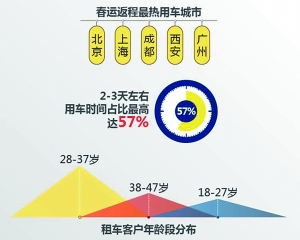 汽車返程用戶中8歲以下占比20%,19至30歲的用戶占比達到42%,31至40歲的用戶占比達18%,汽車返程客流以學生為主,學生和務工客流略有重疊。今年春運還有不少用戶選擇租車返程,租車出行可以異地取、還車,既可全程租賃也可分段租賃,十分自由便捷,途牛為租車用戶提供了1折、新客減100等優(yōu)惠,途牛網(wǎng)顯示,春運中北京、上海、成都、西安、廣州為最熱用車城市,2至3天左右租期占比最高達57%。28至37歲用戶占比最高達51%;38至47歲用戶占比為24%;18至27歲用戶占比18%。
