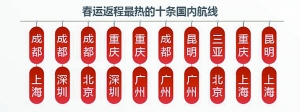由于今年春運返程高峰提前,有些沒搶到火車票的用戶直接搭乘飛機返程使得今年飛機客流高峰集中在了2月2日至15日,之后機票價格開始回落。途牛網(wǎng)顯示,春運返程最熱的十條國內(nèi)航線分別為成都-上海、成都-深圳、成都-北京、重慶-深圳、重慶-廣州、成都-廣州、昆明-廣州、三亞-北京、重慶-上海、昆明-上海。