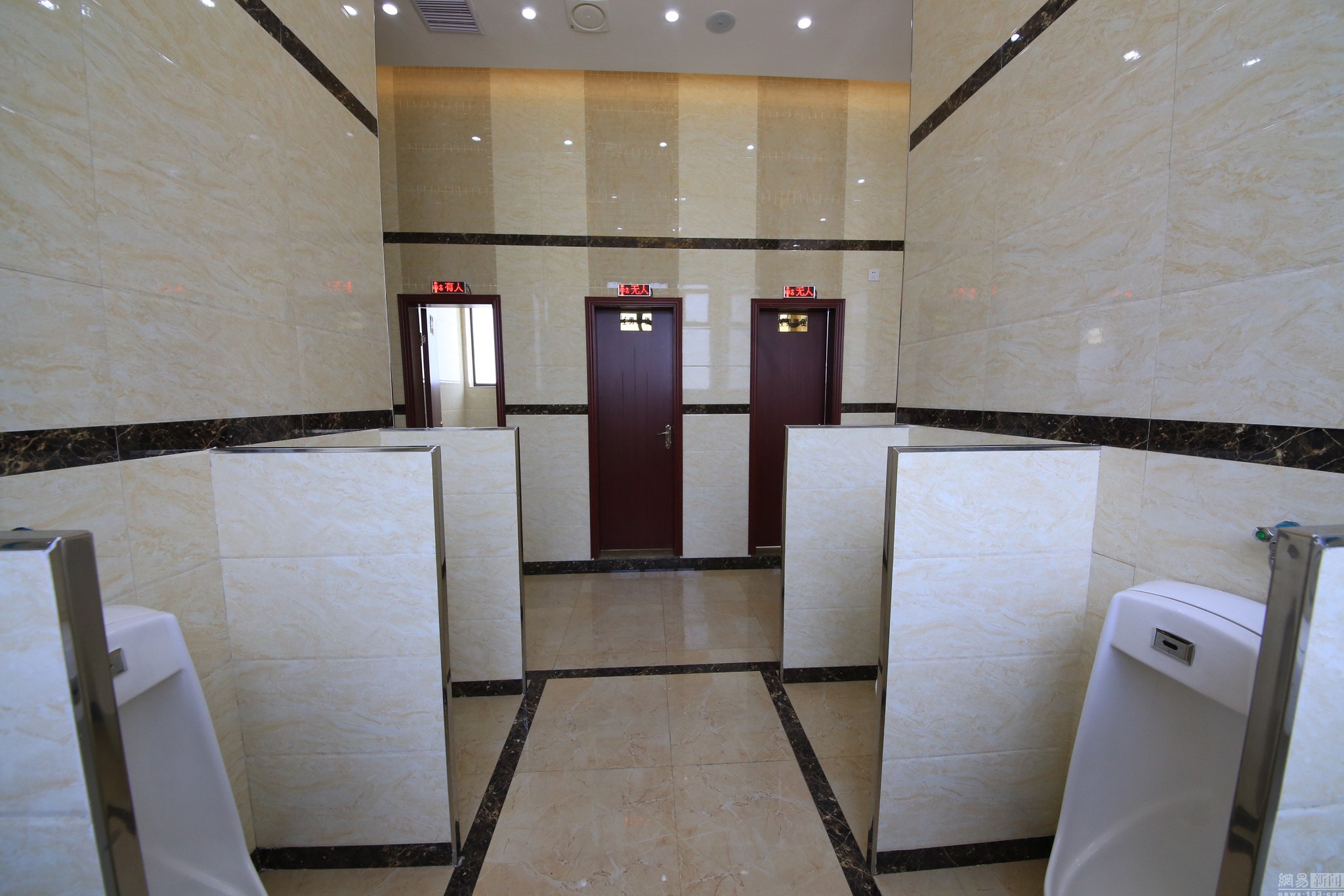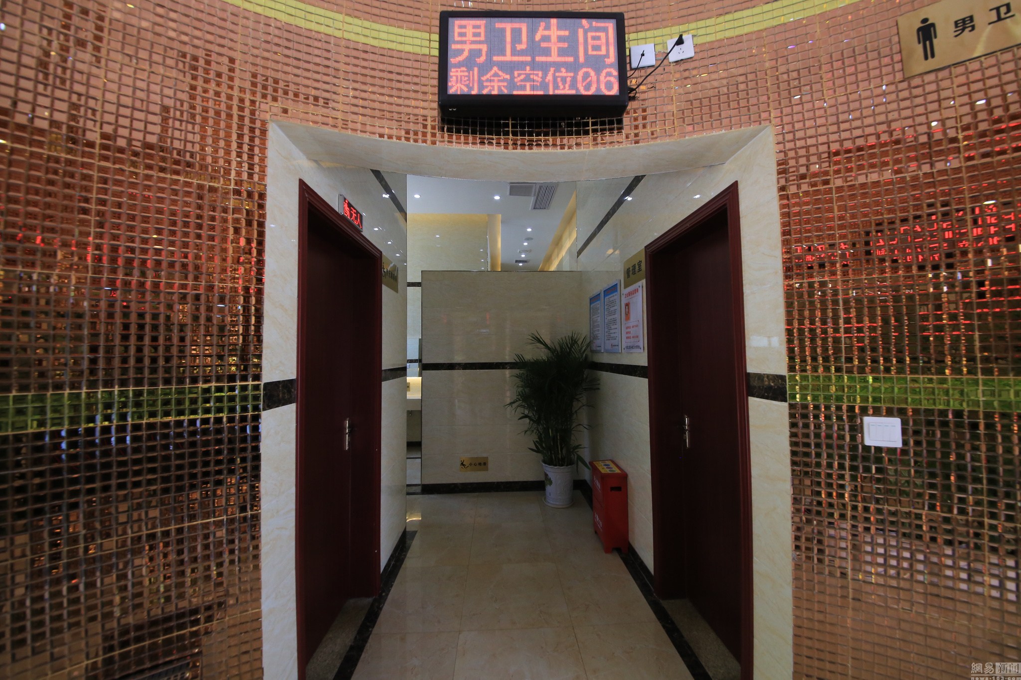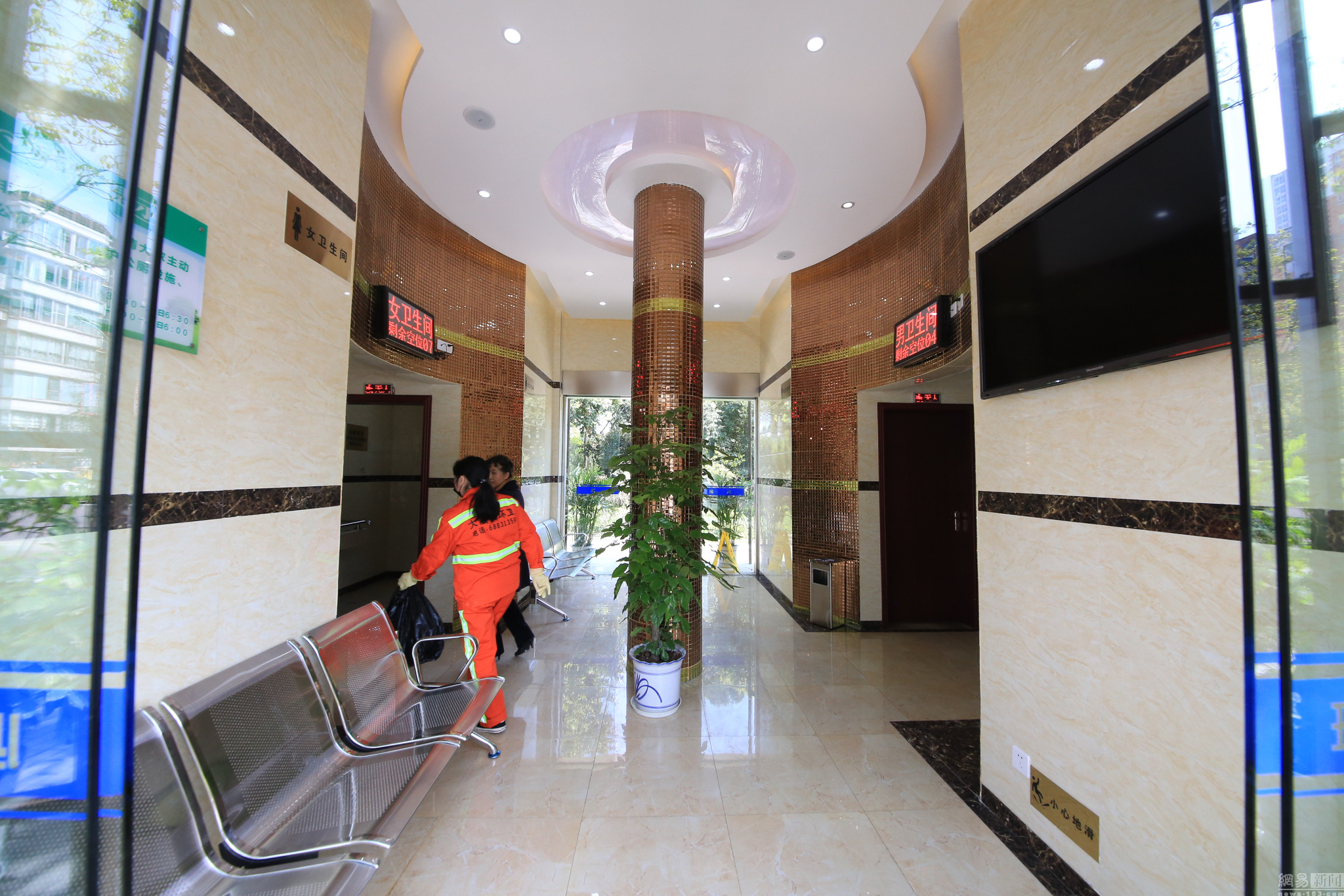 兩旁的電子顯示器顯示著空閑的蹲位數(shù),轉(zhuǎn)彎走入洗手區(qū),一整面墻的鏡子、烘干機等設(shè)備一應(yīng)俱全。公共衛(wèi)生間修建方負責人介紹,該公共衛(wèi)生間內(nèi)有音響設(shè)備共14個,男女洗手間還配備自動噴香機各1個。圖為公廁內(nèi)部,配有電視機。