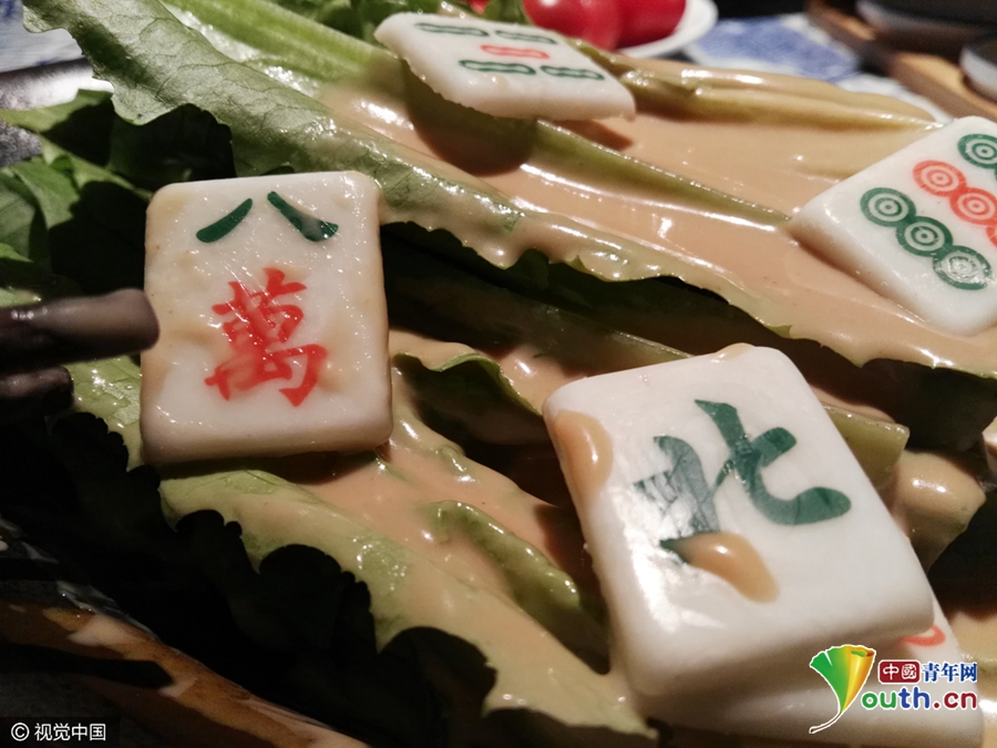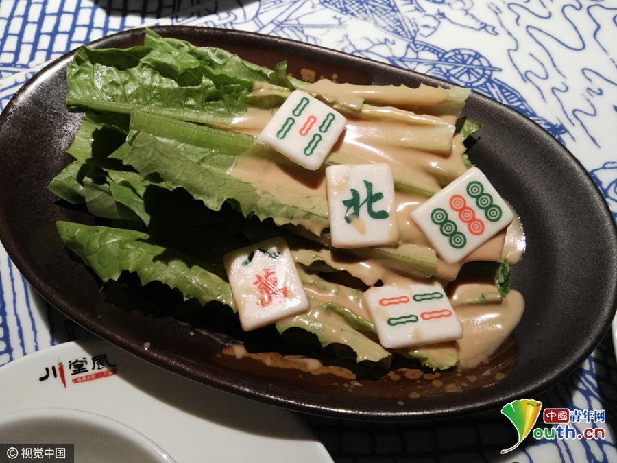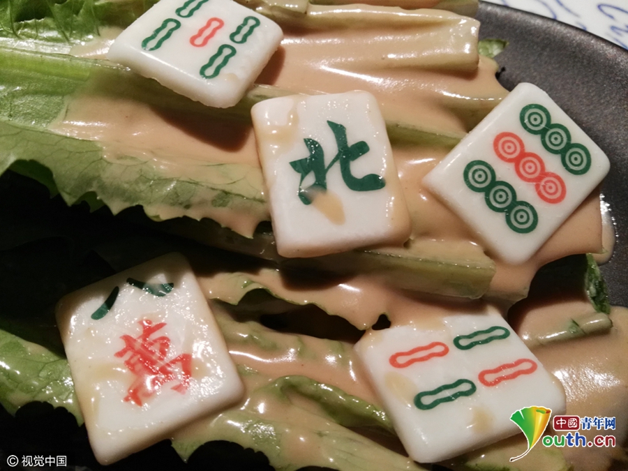 2017年3月30日,上海,麻將是用來搞娛樂活動(dòng),在上海閔行莘莊一家餐廳看到,竟然有一品麻將菜肴,一盤青菜上擺放著麻將中的北風(fēng)、八萬、四條等,仔細(xì)一看這些麻將其實(shí)是形如麻將的巧克力。食客說,吃了這品菜,打麻將保證手氣好。