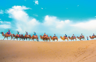 游客騎駱駝暢游敦煌大漠,體驗(yàn)絲路文化。