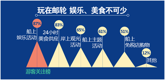 游客最關注郵輪旅游過程中的哪些核心要素?較多游客已逐漸擺脫“郵輪游是指通過郵輪將游客送達某個景點”的狹隘觀念,而是更關注郵輪上的活動、表演以及美食,愿意“玩在郵輪”。眾多郵輪公司也開始在吃的方面更加強調中國特色,從而滿足中國游客的餐飲需求。
