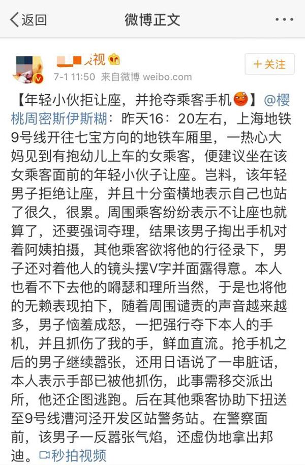 近日,網(wǎng)友發(fā)帖稱,6月30日下午4點20分左右,上海地鐵9號線開往七寶方向的地鐵上,一熱心大媽勸一小伙讓座給抱幼兒上車的女乘客。該男子拒絕讓座,并表示自己也站了很久,很累。隨后,周圍乘客表示,不讓座也就算了,還要強(qiáng)詞奪理。結(jié)果男子拿出手機(jī)對著熱心阿姨拍攝。旁邊乘客想把他的行徑拍下,男子還面帶笑容對鏡頭比“耶”。不久后,指控男子不讓座的原微博被刪除。