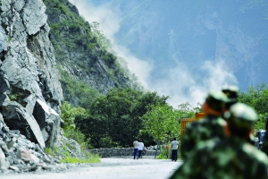 10日上午,記者隨武警交通部隊(duì)進(jìn)入301省道。行進(jìn)途中,兩側(cè)山體不時(shí)有碎石落下,掀起陣陣塵土,道路兩旁堆有不少因地震而被折斷的樹木,以及被落石、樹木壓扁的汽車殘骸。不少武警官兵正在使用破碎錘、挖掘機(jī)等設(shè)備對(duì)道路進(jìn)行清理拓寬工作。