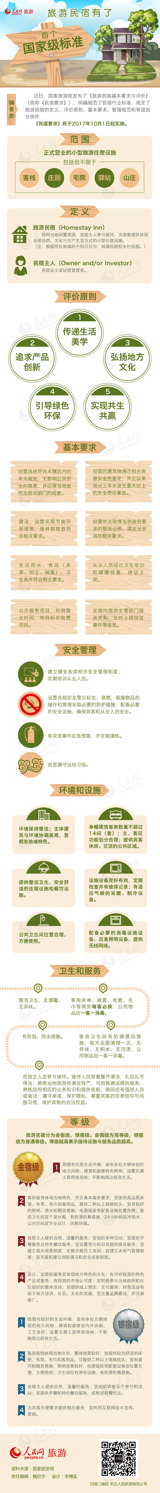人民網(wǎng)北京8月24日電(魏欣寧)近日,國家旅游局發(fā)布了《旅游民宿基本要求與評價(jià)》,明確規(guī)范了民宿行業(yè)標(biāo)準(zhǔn),規(guī)定了旅游民宿的定義、評價(jià)原則、基本要求、管理規(guī)范和等級劃分條件。《旅游民宿基本要求與評價(jià)》將于2017年10月1日起實(shí)施。