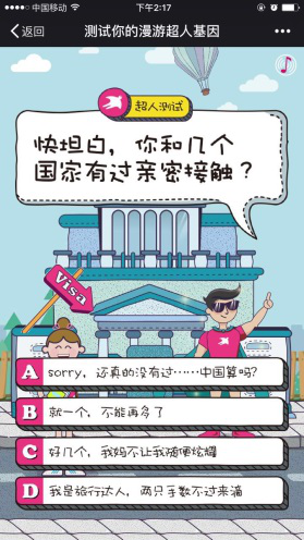 在#尋ME漫游超人#階段,品牌針對受眾愛玩、愛分享、喜歡探索未知、追求不一樣的特性,打造最契合受眾的創(chuàng)意性內(nèi)容,在社交媒體上形成了充分傳播與互動。先是通過富有創(chuàng)意的系列病毒海報,將歷史典故與產(chǎn)品利益點相結(jié)合,引發(fā)了互聯(lián)網(wǎng)人群的共鳴,形成主動擴散傳播;緊接著“測試你的漫游超人基因”爆款H5上線,利用多場景切換方式的娛樂測試新玩法,吸引了包括@貓力molly在內(nèi)的眾多旅行大V主動參與轉(zhuǎn)發(fā),讓娛樂化內(nèi)容成為熱愛旅行人群交流的主要談資。