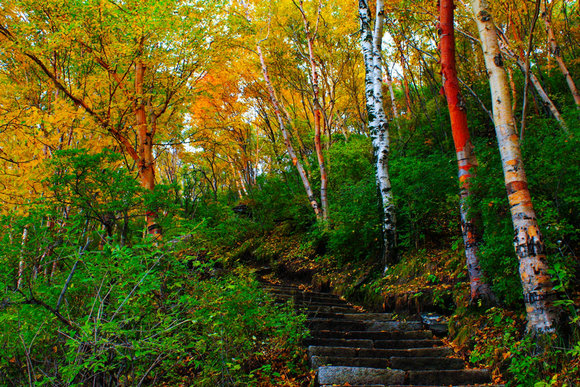 金秋,是白石山最絢麗的季節(jié)!在海拔1600米—2000米之間,生長著萬畝紅樺林。紅樺樹是世界罕見的古樹種,枝干挺拔,樹皮深紅,象征著愛情火熱而圣潔,自古以來就被稱為“愛情樹”。由于特殊的海拔高度和地理位置,白石山的紅樺林會隨著時(shí)間的推移變化,出現(xiàn)紅、黃、綠等色彩交替。