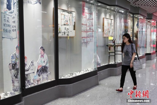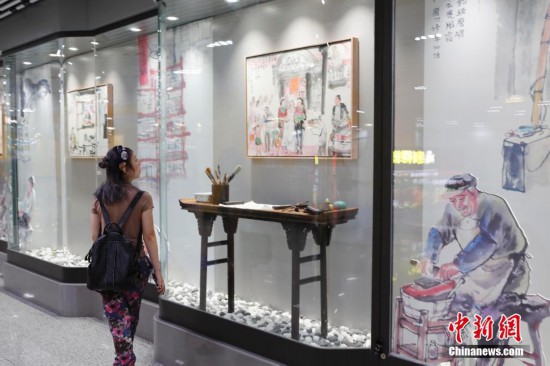 9月3日,市民在在上海地鐵陜西南路站文化長廊內(nèi)欣賞石庫門前的市井生活。近日,在上海地鐵陜西南路站文化長廊開幕的 “上海屋檐下——汪大文作品展”,讓往來乘客們在水墨丹青中重溫改革開放初期的上海里弄風(fēng)情,感悟時代輝煌成就。中新社記者 殷立勤 攝