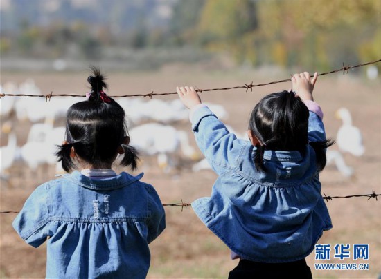 10月31日,在山西平陸黃河濕地內(nèi),小游客在觀看大天鵝嬉戲。新華社記者 楊晨光 攝