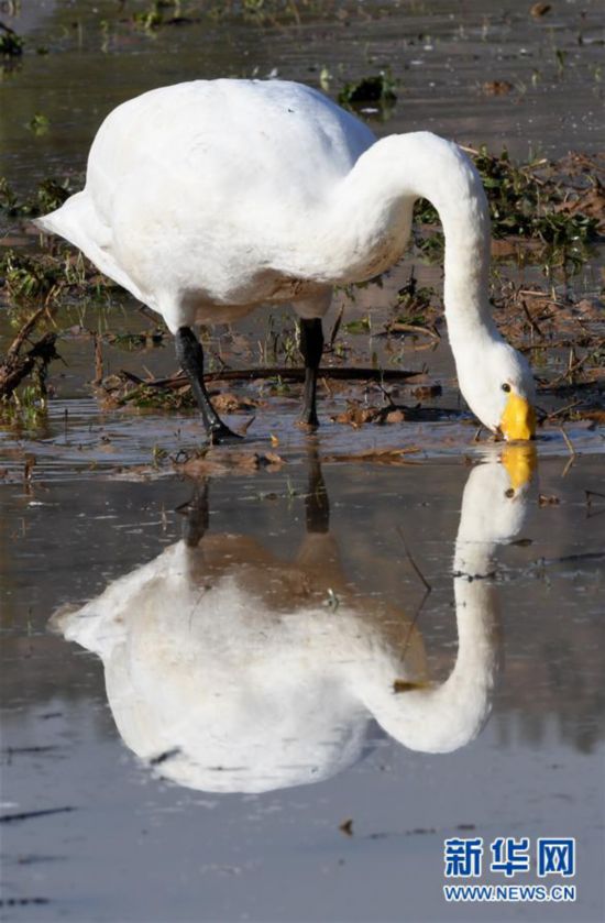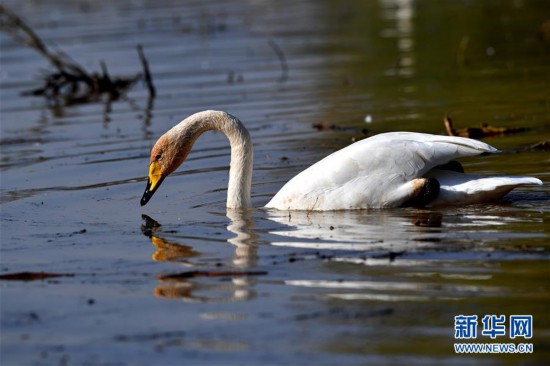 10月30日,大天鵝在山西平陸黃河濕地覓食。新華社記者 楊晨光 攝