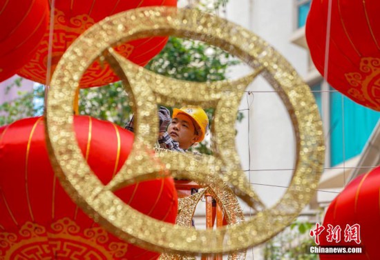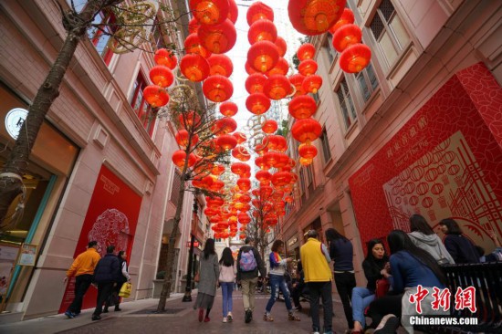 1月27日,農(nóng)歷新年臨近,香港街頭喜慶氣氛越來越濃。工人正在灣仔利東街安裝寓意圓滿的紅燈籠和金光閃閃的金錢。整條步行街上方總共將懸掛668個燈籠和238個金錢,諧音“路路發(fā)”和“易發(fā)”。