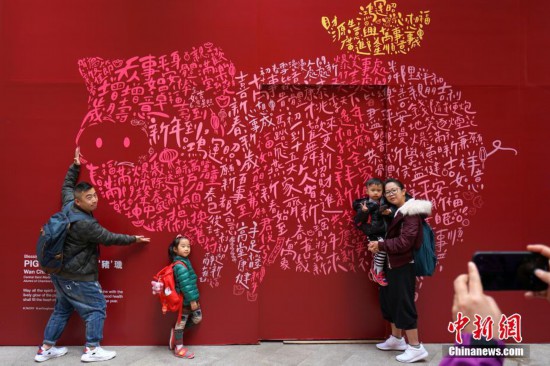 1月27日,農(nóng)歷新年臨近,香港街頭喜慶氣氛越來越濃。一面由各種吉祥話、祝賀語組成的“字字‘豬’璣”墻亮相灣仔利東街,吸引游客拍照留念。