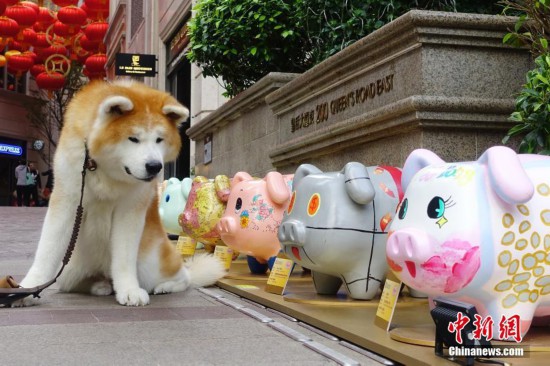 靈感來自“豬仔錢罐”的66只主題藝術(shù)豬由香港大專、中小學(xué)生及多名本地藝術(shù)家設(shè)計及參與制作,主辦方希望通過藝術(shù)豬巡回展覽,加深市民對存款保障計劃的認(rèn)識和了解。圖為一只秋田犬與藝術(shù)豬“對視”。
