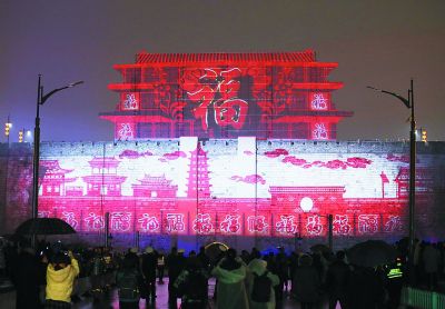 圖為3D光影秀將中華門城堡印滿福字。 本報記者 徐琦 董家訓(xùn)攝