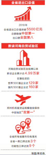 新時(shí)代新使命。內(nèi)陸大省河南,堅(jiān)持開放引領(lǐng),以高水平開放推動(dòng)全省經(jīng)濟(jì)高質(zhì)量發(fā)展。 2018年,全省進(jìn)出口總值突破5500億元,總額穩(wěn)居中部第一,出口額全國(guó)第八;河南自貿(mào)試驗(yàn)區(qū)自掛牌以來,新設(shè)企業(yè)累計(jì)達(dá)4.99萬家;在豫投資的世界500強(qiáng)企業(yè)達(dá)129家,國(guó)內(nèi)500強(qiáng)企業(yè)達(dá)160家;鄭州機(jī)場(chǎng)客貨運(yùn)規(guī)模繼續(xù)保持中部地區(qū)“雙第一”。中部大省河南挺身開放前沿,走出了一條內(nèi)陸地區(qū)開放型經(jīng)濟(jì)發(fā)展的新路子。