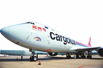 下圖:2014年6月27日,“鄭州—盧森堡”國(guó)際貨運(yùn)航線開通。圖為傲然屹立的“鄭州號(hào)”全貨運(yùn)飛機(jī)。本報(bào)資料圖片