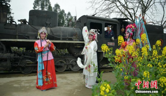 3月12日,游客拍攝嘉陽蒸汽小火車。陽春三月,在花海中穿行的四川省犍為縣嘉陽小火車迎來旅游旺季,海內(nèi)外眾多游客慕名前來乘坐這列開往春天的“小火車”。嘉陽小火車是目前世界上為數(shù)不多的還在正常運(yùn)行的客運(yùn)窄軌蒸汽小火車,保留了蒸汽時(shí)代的加煤、制動(dòng)、扳道等手動(dòng)操作方式。中新社記者 劉忠俊 攝