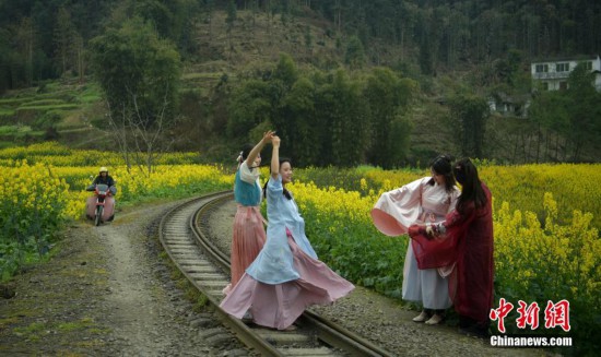 3月12日,身著漢服的游客在窄軌邊游覽。中新社記者 劉忠俊 攝
