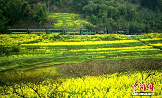 3月12日,嘉陽小火車穿過花海。中新社記者 劉忠俊 攝