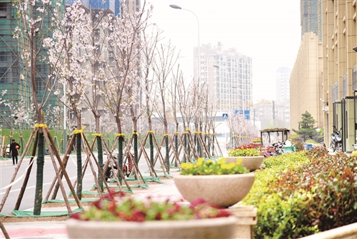 花語路西起長安路、東至御景灣,全長478米、寬20米,道路的兩側(cè)栽植了169株日本早櫻。