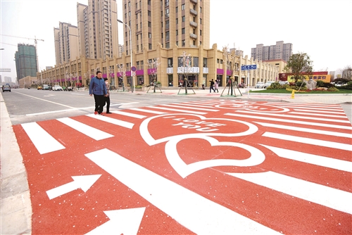 “愛情斑馬線”位于花語路東西兩側(cè)的人行橫道上。整條斑馬線是大紅色底面,中間有一大一小兩顆心形,里面寫有 “I LOVE YOU”字樣。