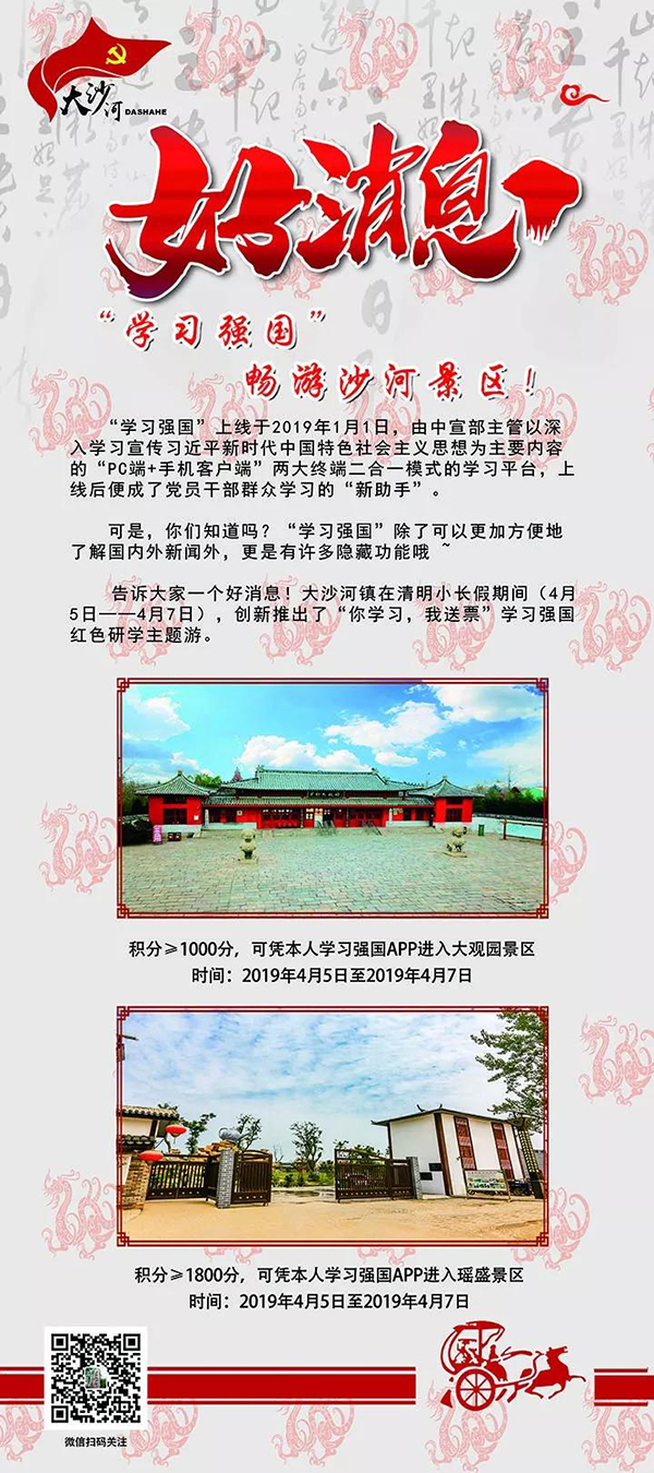 在清明小長(zhǎng)假期間(45—47日),大沙河鎮(zhèn)創(chuàng)新推出你學(xué)習(xí),我送票學(xué)習(xí)強(qiáng)國(guó)紅色研學(xué)主題游活動(dòng)!