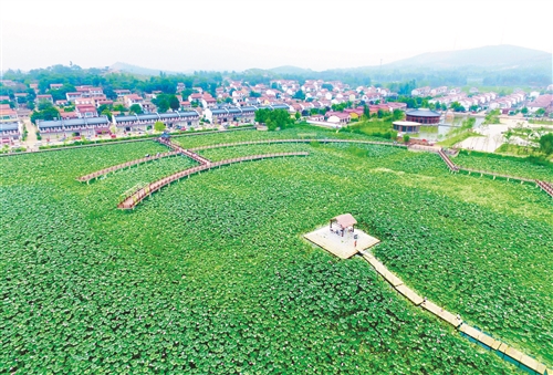 一池的綠,一池?zé)o聲的歌,站在觀荷亭眺望,北村村三面青山、一片碧湖,粉墻黛瓦的古老村落沿著山勢(shì)錯(cuò)落,村舍、青煙相映成趣;高樹(shù)、低柳俯仰生姿;綠草如茵,鮮花盛開(kāi),構(gòu)成了一幅美麗的鄉(xiāng)村畫(huà)卷。