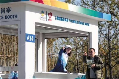 10月7日,世園會(huì)志愿者在為游客服務(wù)。