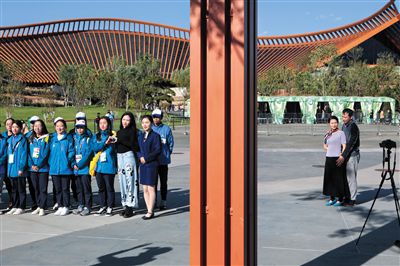 10月7日,世園會(huì)中國(guó)館外,游客和工作人員各自在留影。當(dāng)天是2019世園會(huì)最后一天開放。