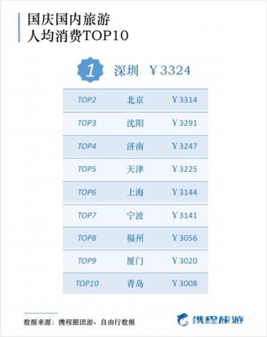 哪些城市居民的平均消費最高?“國內游消費力前十強城市”依次為深圳、北京、沈陽、濟南、天津、上海、寧波、福州、廈門和青島。這些城市國慶旅游單次國內游人均花費超過3000元,其中深圳人最舍得花錢,單次國內旅游人均花費達到了3324元。