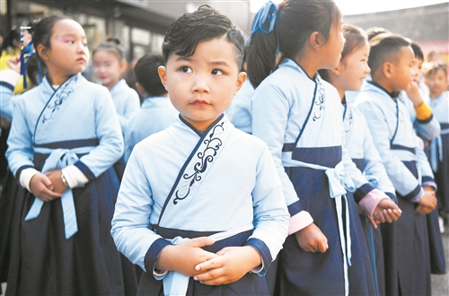 19日下午,開筆禮的主人翁——彭城書院公益國學(xué)啟蒙班及附屬明德學(xué)府的100名小弟子們在戶部山南山廣場一絲不茍地體驗了古代“開筆禮”的規(guī)范儀程,正衣冠、拜孔子、點朱砂、擊鼓振志。在“源遠(yuǎn)流長 漢家霓裳”漢服復(fù)原品T臺活動中,15套復(fù)原漢服囊括了漢、魏晉、唐、宋、明等不同朝代,通過服飾搭配、妝面設(shè)計、發(fā)髻造型,復(fù)原漢服鮮明的朝代特色。