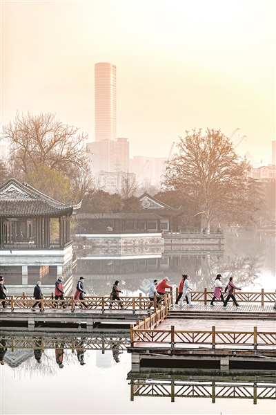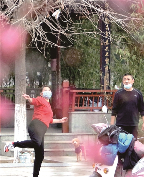 圖2:市民在古黃河公園內(nèi)健身踢毽子。
