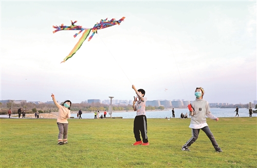 圖3:大龍湖畔的大草坪成為市民放風(fēng)箏的好去處。