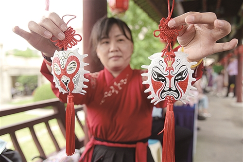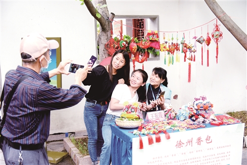 設于徐博乾隆行宮院內(nèi)的非遺項目展示展銷涵蓋了傳統(tǒng)美術、傳統(tǒng)技藝和傳統(tǒng)醫(yī)藥類近40項國家級、省、市、區(qū)級非遺項目。為期三天的“非遺集市”從早上9時持續(xù)到晚上9時。13日這天一大早,徐州香包、下邳蒲扇等非遺項目的傳承人帶著各自的產(chǎn)品在乾隆行宮的走廊、亭臺設下攤位,市文廣旅局的對口幫扶單位沛縣河口鎮(zhèn)共和村帶來了新近投產(chǎn)的牛蒡制品。園林中琳瑯滿目的非遺產(chǎn)品吸引了市民圍觀采購。