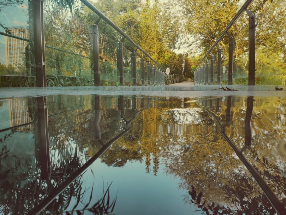 玻璃橋位于金龍湖珠山宕口公園內(nèi)橋面采用鋼化玻璃設(shè)計藍(lán)天白云倒映在玻璃橋上隨手一拍就是絕妙的網(wǎng)紅照。