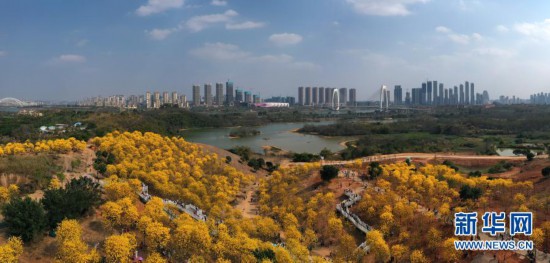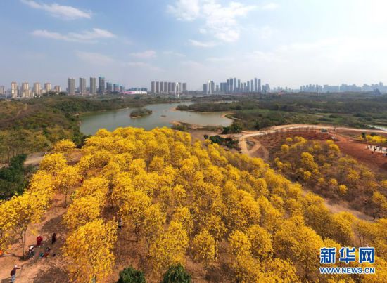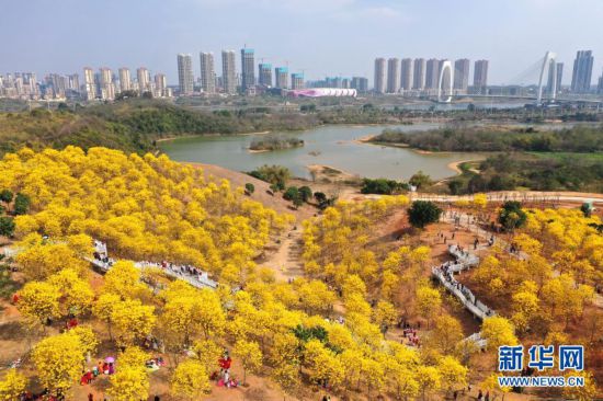 2月21日,游人在南寧市青秀山風(fēng)景區(qū)觀賞盛開的黃花風(fēng)鈴木(無人機(jī)照片)。這是南寧市青秀山風(fēng)景區(qū)盛" />