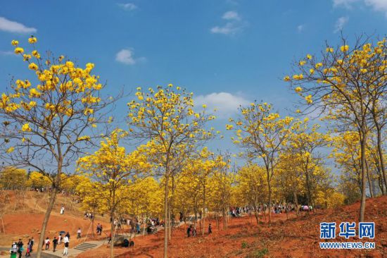 2月21日,游人在南寧市青秀山風(fēng)景區(qū)觀賞盛開的黃花風(fēng)鈴木。