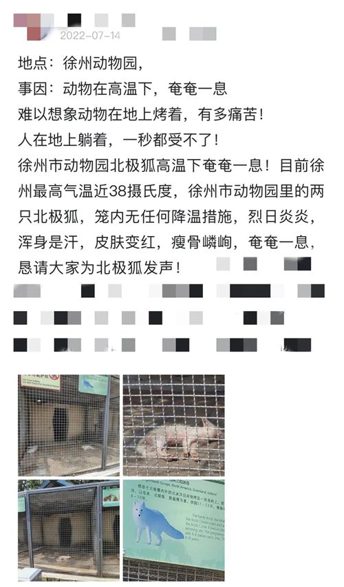 7月14日,有網(wǎng)友在網(wǎng)絡平臺發(fā)文,稱徐州動物園中的兩只北極狐在高溫下“奄奄一息”“皮膚變紅,骨瘦嶙峋”。