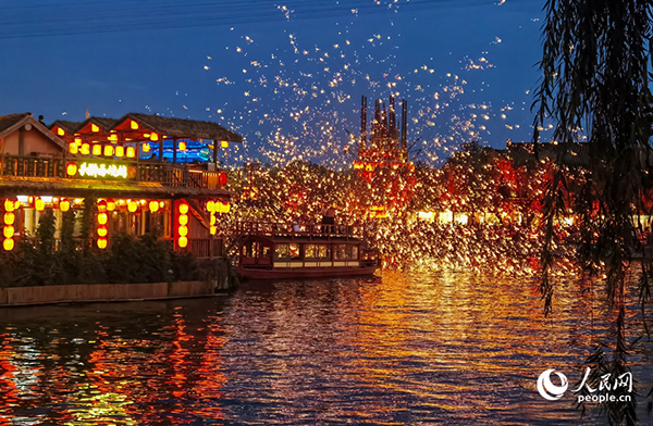 清明上河園景區(qū)內(nèi)打鐵花表演。人民網(wǎng)記者 尚明楨攝