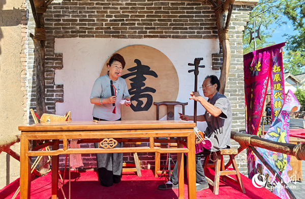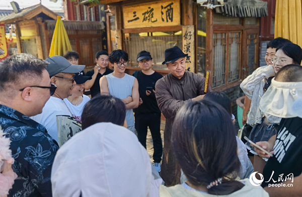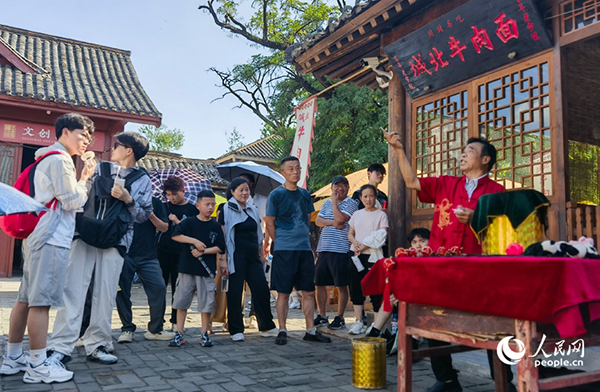 萬歲山武俠城景區(qū),演員與游客成語接龍,互動(dòng)熱烈。人民網(wǎng)記者 尚明楨攝