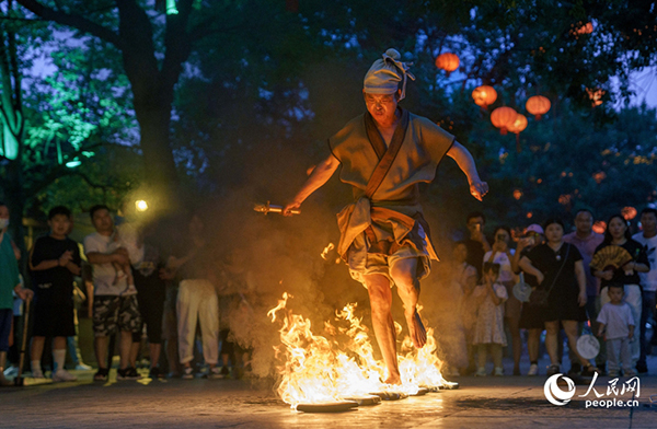 清明上河園景區(qū),演員正在表演口吐火龍。人民網(wǎng)記者 尚明楨攝