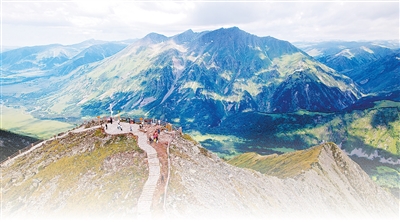 吉克普林云霄峰是阿爾泰山脈的高峰之一,山頂可俯瞰中俄哈蒙四國(guó)風(fēng)光,形成“一腳踏四方”的地理奇觀。