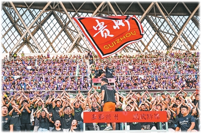 9月19日,2025城市足球邀請賽在貴州省貴陽市奧體中心體育館開賽。圖為觀眾在現(xiàn)場加油。