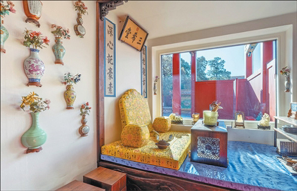 聞名遐邇的三希堂,位于養(yǎng)心殿內(nèi)西暖閣,原為乾隆的書房,名溫室,后因乾隆年間收藏王羲之《快雪時(shí)晴帖》、王獻(xiàn)之《中秋帖》、王珣《伯遠(yuǎn)帖》三件稀世墨寶而得名,“三希”亦含“士希賢、賢希圣、圣希天”的修身箴言。透過(guò)明亮的玻璃,觀眾可以看到,堂內(nèi)墻上還懸掛著各式瓷瓶,瓶中插有寶石花。