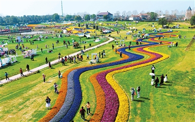 游客在武漢花博匯賞花游覽。