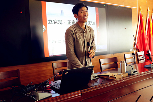 開講之前,漢風(fēng)先生向社區(qū)黨委書記付化友同志授予“彭城書院國學(xué)經(jīng)典誦讀推廣中心下淀分中心”的牌匾后,漢風(fēng)先生主講了“立家規(guī)、正家風(fēng)、傳家訓(xùn)”。近一個小時的演講,學(xué)者以深入淺出、詼諧幽默的演說,迎來掌聲陣陣。
