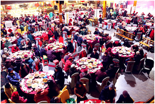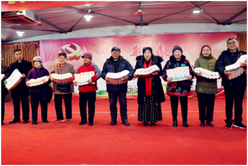 演出結(jié)束后,社區(qū)將600多位涉農(nóng)老人請到大排檔歡宴,共度新春佳節(jié)。宴會開始前,社區(qū)兩委班子為大家發(fā)紅包,整個大廳熱鬧非凡。