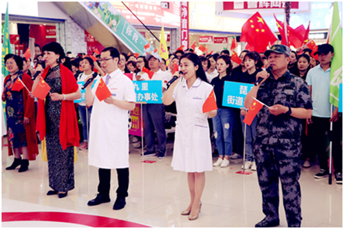 活動(dòng)在《我和我的祖國(guó)》歌曲中開始,整個(gè)現(xiàn)場(chǎng)歌聲飛揚(yáng),國(guó)旗飄飄;顒(dòng)圍繞2019年世界無煙日的宣傳主題:煙草和肺部健康,開展“健康江蘇”系列主題活動(dòng),共同營(yíng)造碧水藍(lán)天的優(yōu)美人居環(huán)境。為使活動(dòng)圓滿成功,5月23日,鼓樓區(qū)愛委會(huì)在下淀社區(qū)黨員活動(dòng)中心組織了彩排。今天,下淀社區(qū)又組織了揮舞國(guó)旗的8名隊(duì)員和80人的方隊(duì)助威。黨委書記付化友還擔(dān)任了《我和我的祖國(guó)》領(lǐng)唱之一。