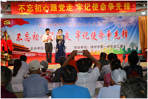 6月27日上午,徐州下淀社區(qū)黨委聯(lián)合徐州一中關(guān)工委,在社區(qū)黨員服務(wù)中心舉行“不忘初心跟黨走 牢記使命爭先鋒”優(yōu)秀黨員表彰大會暨慶祝中國共產(chǎn)黨建黨98周年文藝演出。